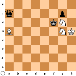 1 Bd8+ Kf5 2 Ne7+ Kf4 3 Bc7+ Ke3 4 Bb6+ QxB6 5 Nd5+ and 6 Nxb6