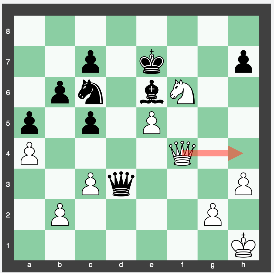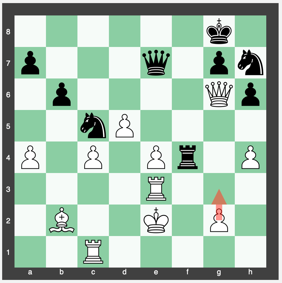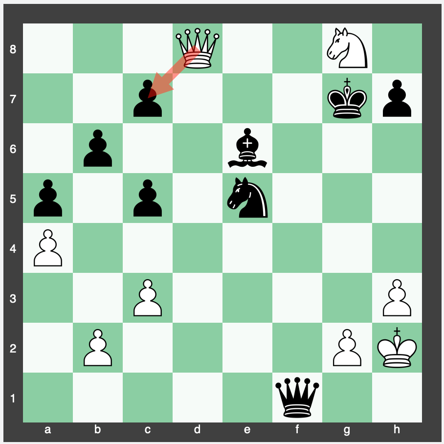1 c7 b2 2 Bg6 Kxg6 3 c8=Q b1=Q 4 Qxg4+ Kh6 5 Qh4+ Kg6 6 Qh7+