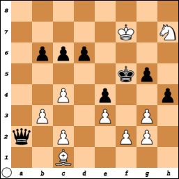 1 g4+ Ke5 (1…Kxg4 2 Kg6) 2 Bb2+ Qxb2 3 Nf6 d5 4 c5 bxc5 (4…d4 5 Nd7+ Kd5 6 Nb6+ Kxc5 7 Na4+) 5 Ke7 d4 6 Nd7+ Kd5 7 Nb6+ Ke5 8 Nc4+